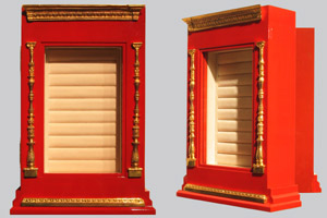 Die Messingornamente auf der Vorderseite wurden vom Kunden mitgebracht und auf dessen Wunsch integriert. Die Vitrine selbst ist nach Vorlage Rot gefaßt und anschließen auf Hochglanz lackiert.